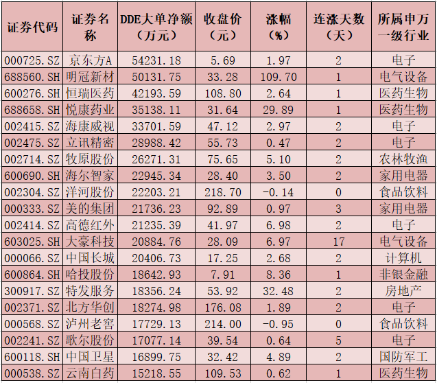 一、周四(12月24日)DDE大單資金凈買入TOP20