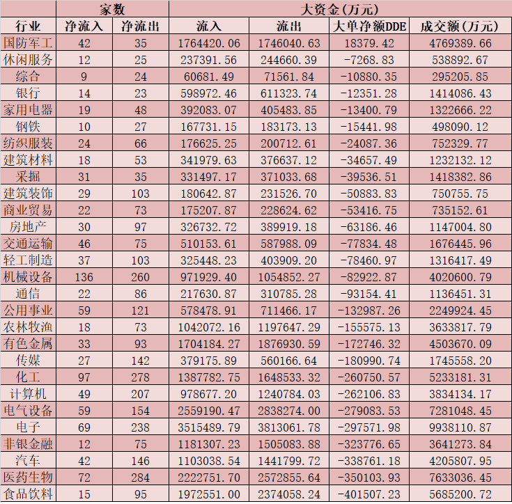 二、周四(12月24日)申萬一級行業(yè)大單資金流向