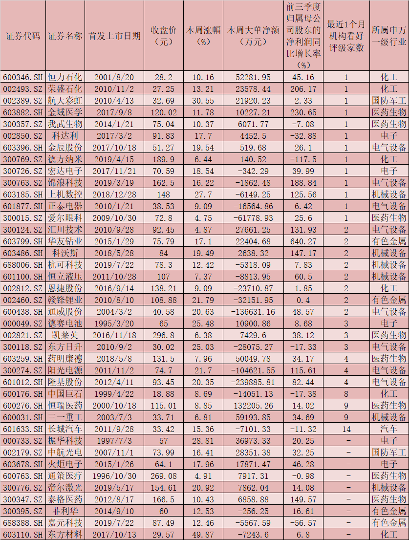 首先,績(jī)優(yōu)股占主流。上述40只強(qiáng)勢(shì)股中,有32只個(gè)股前三季度凈利潤(rùn)實(shí)現(xiàn)同比增長(zhǎng),占比80%。華友鈷業(yè)、金域醫(yī)學(xué)、榮盛石化、錦浪科技、泰格醫(yī)藥、科沃斯、匯川技術(shù)、上機(jī)數(shù)控、陽(yáng)光電源等9只個(gè)股前三季度凈利潤(rùn)同比增幅超100%。