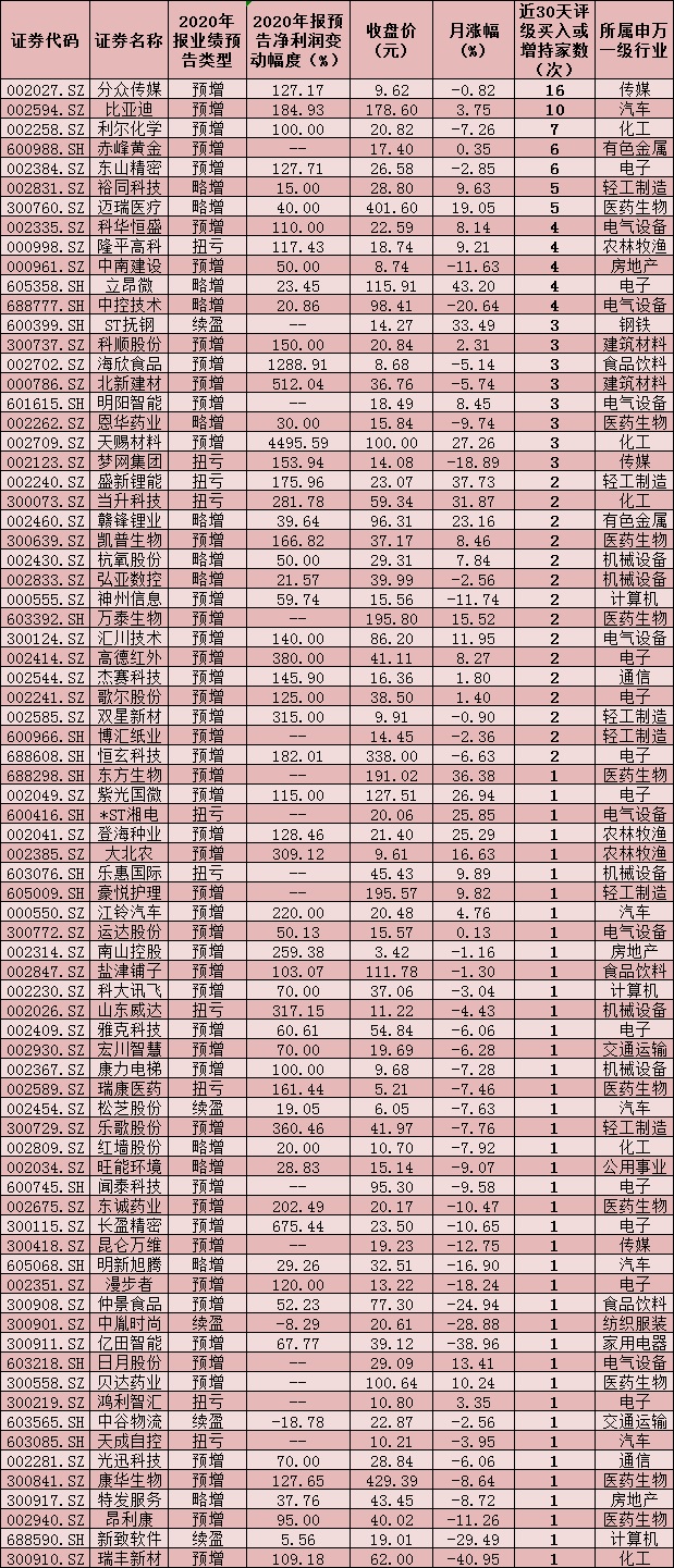 表:機構(gòu)近30日內(nèi)給予“買入”或“增持”以上評級的年報預喜公司情況:
