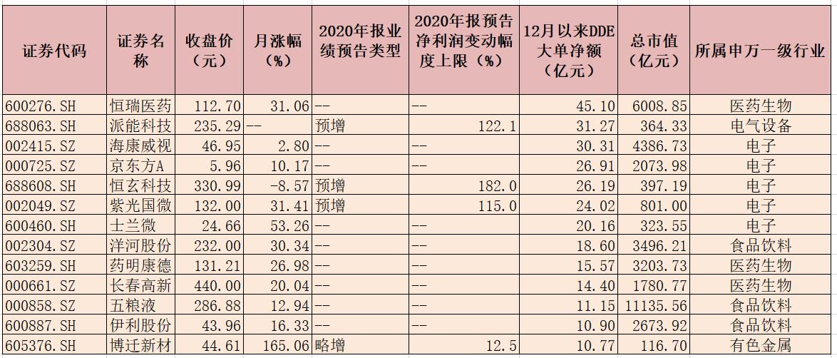 表:12月份以來大單資金凈流入超10億元個股一覽
