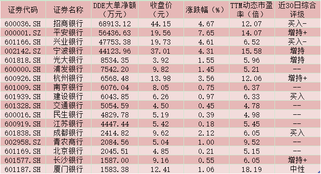 表:周三銀行板塊大單資金凈買(mǎi)入超1000萬(wàn)元個(gè)股一覽