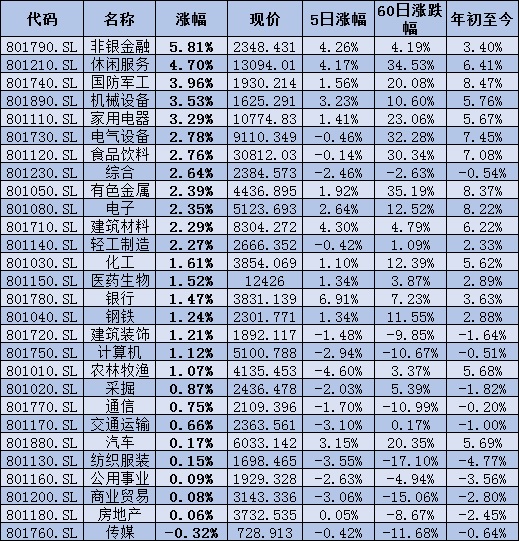 從行業(yè)來看,申萬一級28個行業(yè)多數(shù)飄紅。其中,非銀金融行業(yè)表現(xiàn)強勢,漲幅居首,達5.81%;緊隨其后的是休閑服務、國防軍工、機械設備、家用電器等四行業(yè),漲幅均超3%,分別為4.7%、3.96%、3.53%和3.29%;僅有傳媒行業(yè)出現(xiàn)下跌,跌幅為0.32%。