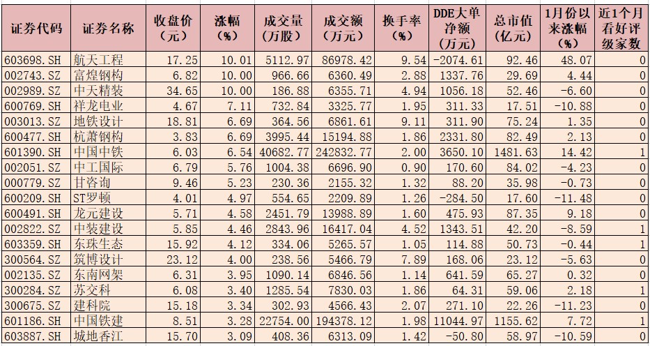 表:1月14日漲幅超3%建筑裝飾行業(yè)個(gè)股一覽