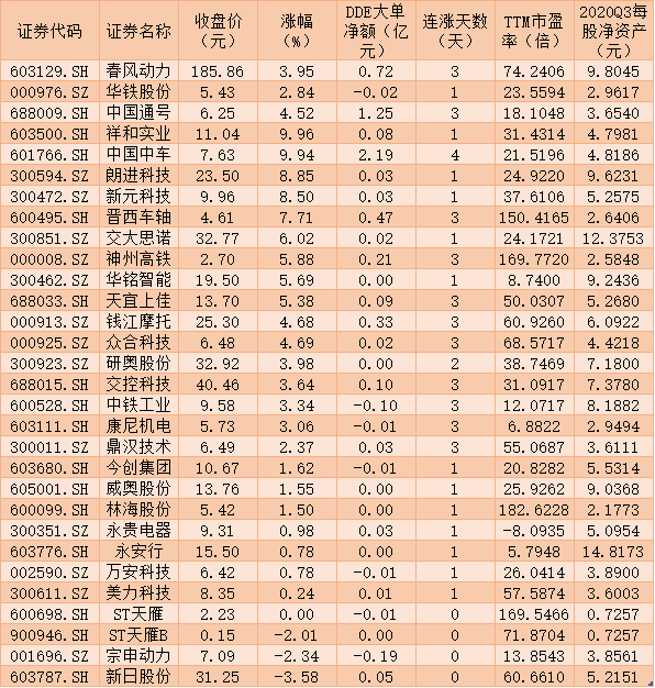 大單資金也對交運(yùn)設(shè)備股進(jìn)行了大量增倉。據(jù)《證券日報(bào)》記者通過IFIND統(tǒng)計(jì)顯示,周四交運(yùn)設(shè)備板塊有30只個(gè)股累計(jì)呈DDE大單主動(dòng)凈流入態(tài)勢,合計(jì)凈流入5.31億元,其中,中國中車(2.19億元)、中國通號(1.25億元)、春風(fēng)動(dòng)力(0.72億元)、晉西車軸(0.47億元)、錢江摩托(0.33億元)、神州高鐵(0.21億元)、交控科技(0.10億元)等7只個(gè)股DDE大單凈買入額均超1000萬元,合計(jì)5.27億元。