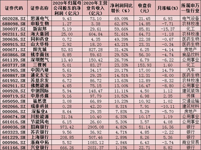 凈利潤(rùn)方面,公布業(yè)績(jī)快報(bào)的31家公司去年全部實(shí)現(xiàn)盈利。其中,凈利潤(rùn)超1億元的公司達(dá)27家。值得關(guān)注的是,有3家公司凈利潤(rùn)在100億元以上的。凈利潤(rùn)最高的是招商銀行,2020年實(shí)現(xiàn)凈利潤(rùn)973.42億元,其次是興業(yè)銀行和上海銀行,凈利潤(rùn)分別為666.26億元、208.85億元。另外,上港集團(tuán)、陽(yáng)光城、川投能源、海大集團(tuán)、深圳燃?xì)獾?家公司,凈利潤(rùn)均超10億元。