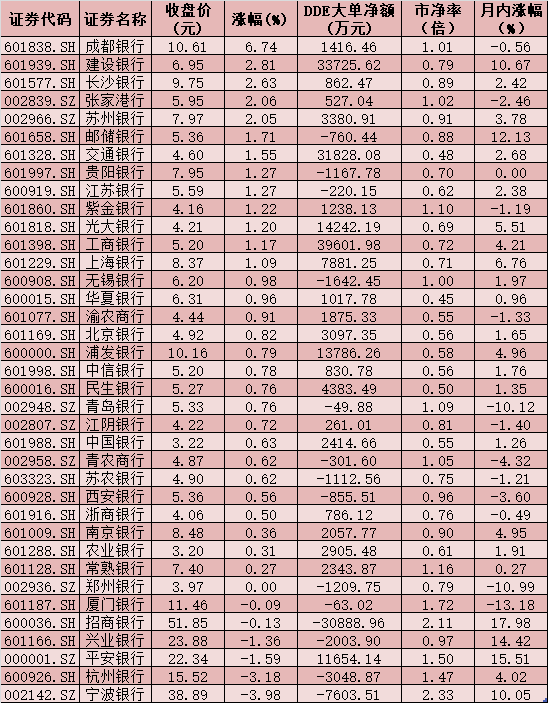 可以看到,今年以來,共有24只銀行股實(shí)現(xiàn)上漲,占行業(yè)成份股家數(shù)比例超過六成,其中,招商銀行、平安銀行、興業(yè)銀行、郵儲(chǔ)銀行、建設(shè)銀行、寧波銀行等6只個(gè)股期間累計(jì)漲幅均在10%以上。