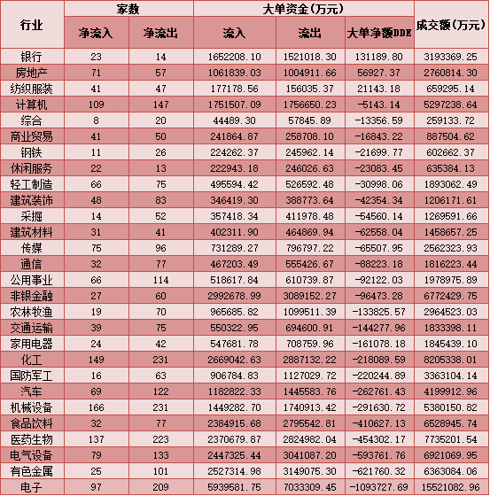 二、周二(1月19日)申萬(wàn)一級(jí)行業(yè)大單資金流向