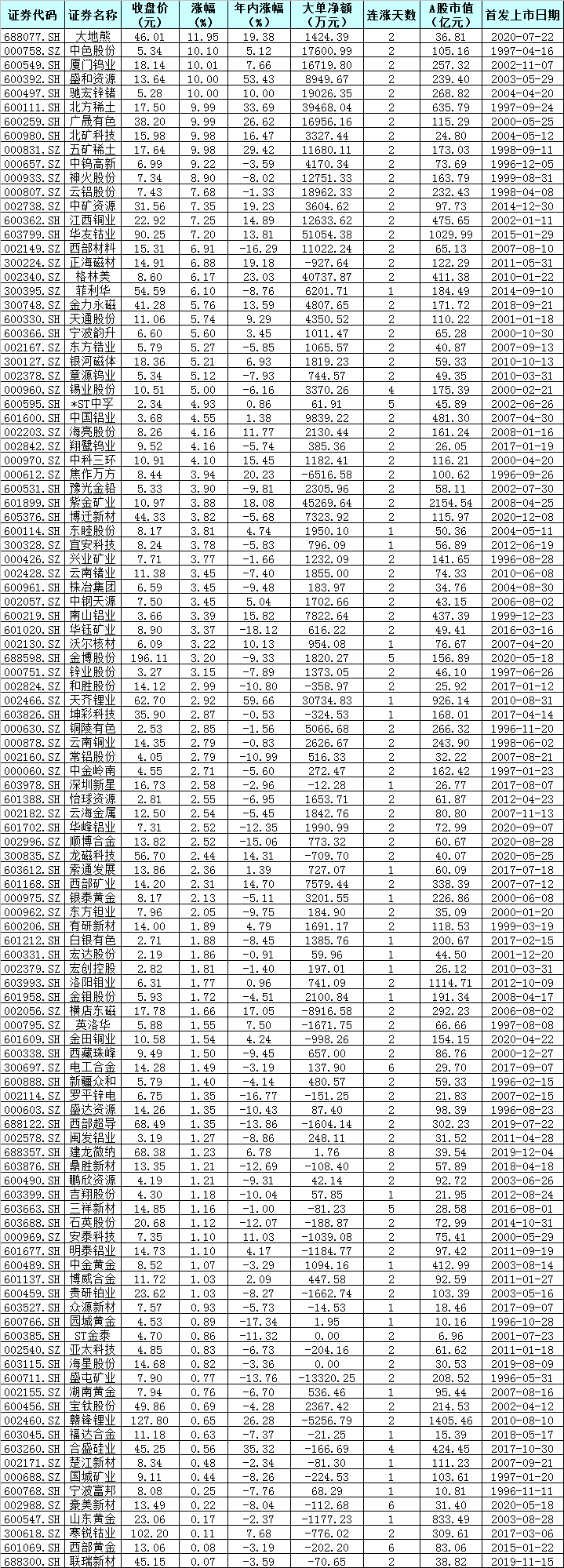從2.81%到3.51%,近兩個交易日,有色金屬行業(yè)漲幅進一步抬升,行業(yè)內(nèi)成份股也是頻現(xiàn)批量漲停。僅從1月21日來看,就有中色股份、廈門鎢業(yè)、盛和資源、馳宏鋅鍺、北方稀土、廣晟有色、北礦科技、五礦稀土等8只個股聯(lián)袂漲停。
