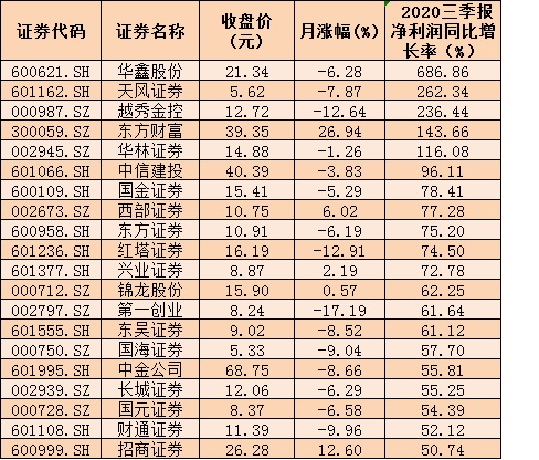 數(shù)據(jù)是最好的佐證。從已披露的2020年三季報業(yè)績來看,在49家上市券商中,有44家公司實現(xiàn)凈利潤同比增長,占比近九成。其中,華鑫股份、天風證券、越秀金控、東方財富、華林證券等公司,凈利潤同比增長均超100%。