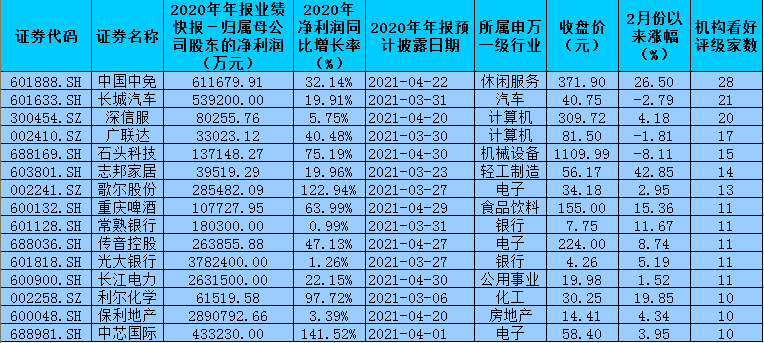 的確,自A股進(jìn)入年報(bào)披露期之后,核心資產(chǎn)業(yè)績(jī)表現(xiàn)對(duì)股價(jià)的傳導(dǎo)在市場(chǎng)中變得極為敏感,機(jī)構(gòu)的選股壓力明顯增大。在這一背景下,上述171家2020年凈利潤(rùn)實(shí)現(xiàn)同比增長(zhǎng)的公司中,仍有86家公司最近1個(gè)月內(nèi)被機(jī)構(gòu)給予“買入”或“增持”等看好評(píng)級(jí),其中,15家公司機(jī)構(gòu)看好評(píng)級(jí)家數(shù)在10家以上,中國(guó)中免、長(zhǎng)城汽車、深信服等3只個(gè)股機(jī)構(gòu)看好評(píng)級(jí)家數(shù)均在20家及以上,分別為28家、21家、20家。