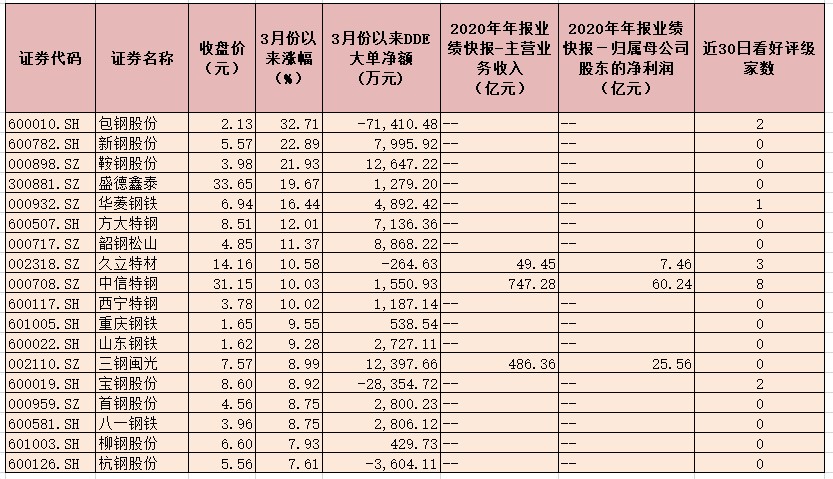 表:3月份以來漲幅超7%鋼鐵股一覽