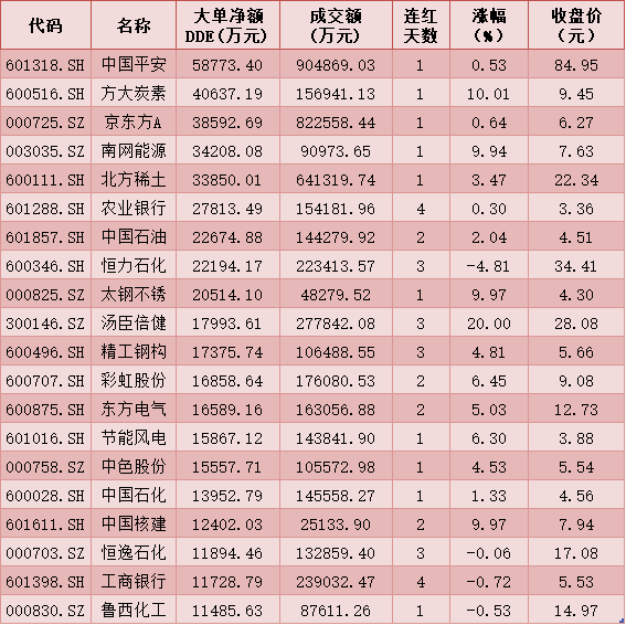 一、周一(3月8日)DDE大單資金凈買(mǎi)入TOP20