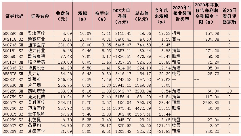 制表:3月10日漲幅超5%醫(yī)藥股一覽