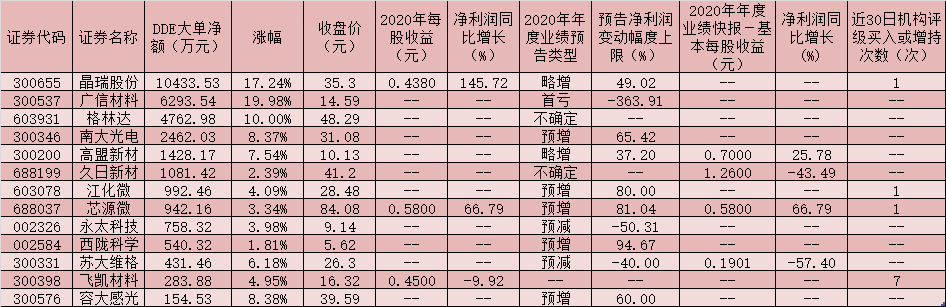 同時(shí),截至目前,還有12家公司也披露了2020年年度業(yè)績(jī)預(yù)告,8家公司業(yè)績(jī)預(yù)喜。光華科技預(yù)計(jì)2020年全年凈利潤(rùn)同比增長(zhǎng)233.20%;西隴科學(xué)、江化微、南大光電、雅克科技、容大感光等5家公司均預(yù)計(jì)2020年全年凈利潤(rùn)同比增長(zhǎng)50%以上。