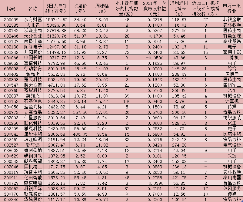 在上述本周被機(jī)構(gòu)調(diào)研的174家公司中,157家公司2021年一季度實(shí)現(xiàn)凈利潤同比增長,占比逾九成。其中,有84家公司報(bào)告期內(nèi)實(shí)現(xiàn)凈利潤同比翻番,華鵬飛、盛和資源、中泰化學(xué)、萬潤科技、雅化集團(tuán)、三泰控股、美錦能源等7家公司報(bào)告期內(nèi)實(shí)現(xiàn)凈利潤同比增長10倍以上。