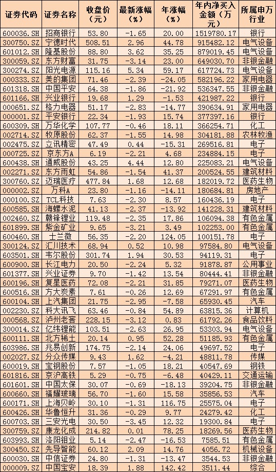 《證券日報》記者根據(jù)同花順統(tǒng)計發(fā)現(xiàn),從滬股通、深股通前十大成交活躍股來看,今年以來,共有81只個股現(xiàn)身前十大成交活躍股榜單,48只活躍股處于期間凈買入狀態(tài),北向資金合計凈買入1063.02億元。其中,招商銀行(151.98億元)、寧德時代(91.55億元)、隆基股份(87.9億元)、東方財富(64.9億元)、陽光電源(61.77億元)、美的集團(58.22億元)、中國平安(53.63億元)等個股,年內(nèi)北向資金合計凈買入額居前,均在50億元以上,多數(shù)為藍籌股。