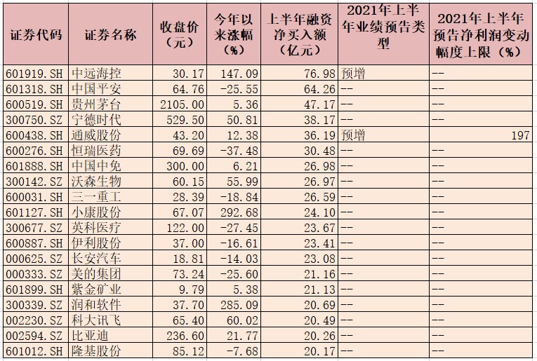 個股方面,今年上半年,共有1058只股票獲融資客加倉,其中,有440只個股期間融資凈買入額均超過1億元,中遠海控、中國平安、貴州茅臺期間融資凈買入額居前三,分別為76.98億元、64.26億元、47.17億元,寧德時代、通威股份、恒瑞醫(yī)藥、中國中免、沃森生物、三一重工等6只個股期間融資凈買入額均超過26億元。