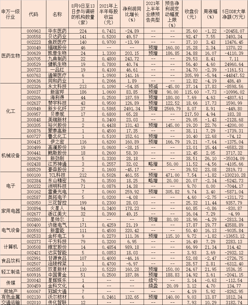可以看到,良好的業(yè)績表現(xiàn)是吸引機構(gòu)頻繁調(diào)研的重要支撐。在上述本周被機構(gòu)調(diào)研的50家公司中,截至目前,已有44家公司披露了2021年上半年業(yè)績,報告期內(nèi)實現(xiàn)凈利潤同比增長的公司共有36家。其中,包括新鄉(xiāng)化纖、維宏股份、TCL科技、新雷能、雷曼光電、九典制藥等在內(nèi)的18家公司2021年上半年凈利潤均實現(xiàn)同比翻番。