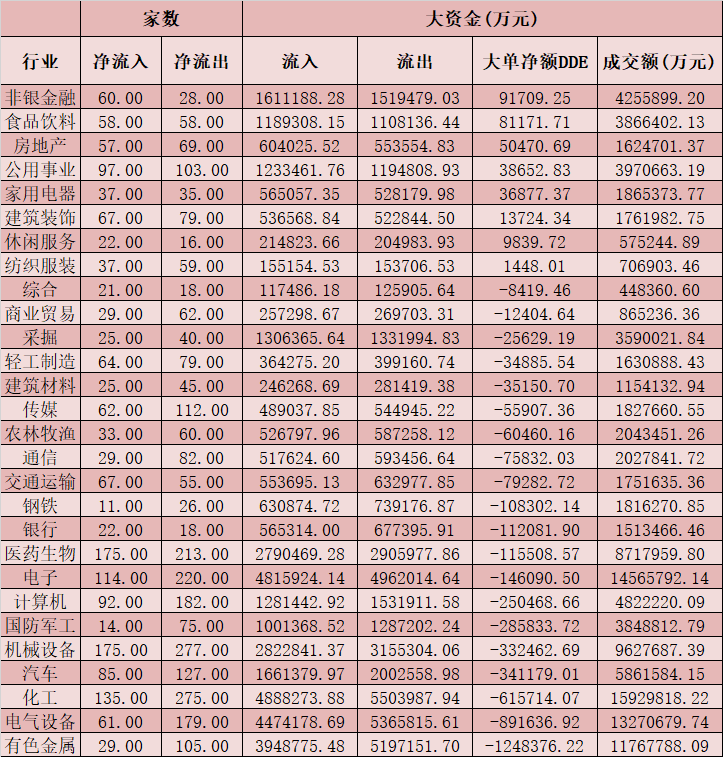 二、周一(8月16日)申萬(wàn)一級(jí)行業(yè)大單資金流向