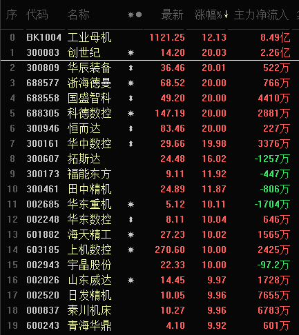 從盤面來看,工業(yè)母機(jī)概念板塊大漲,指數(shù)飆升12.13%,創(chuàng)世紀(jì)、華辰裝備、國盛智科、恒而達(dá)等7股獲20CM漲停。