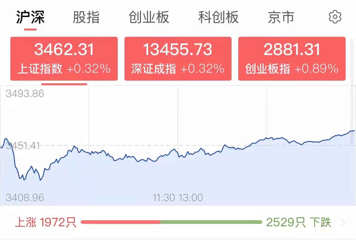 周一,A股三大指數(shù)探底回升,集體收漲,截至收盤,上證指數(shù)漲0.32%,報(bào)3462.31點(diǎn);深證成指漲0.32%,報(bào)13455.73點(diǎn);創(chuàng)業(yè)板指漲0.89%,報(bào)2881.31點(diǎn);滬深兩市合計(jì)成交額9491億元;北向資金凈買入20.47億元;總體來看,兩市個(gè)股跌多漲少。