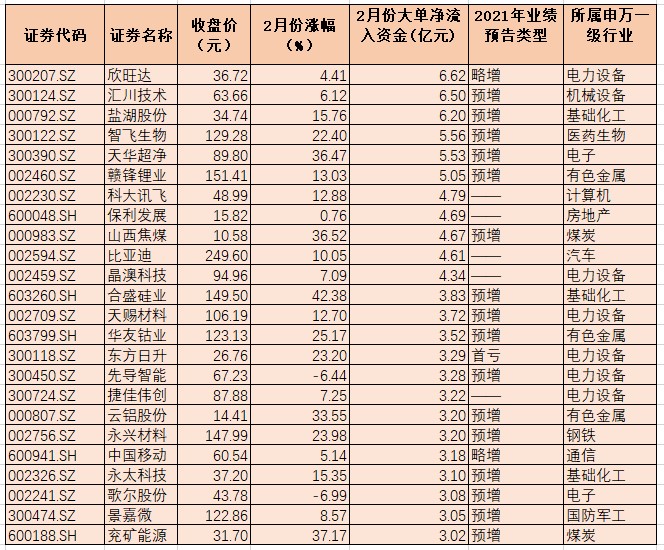 具體來(lái)看,東方財(cái)富Choice數(shù)據(jù)顯示,2月份,有860只個(gè)股期間呈現(xiàn)大單資金凈流入態(tài)勢(shì),占A股總數(shù)為18.17%。其中,欣旺達(dá)、匯川技術(shù)、鹽湖股份等3只個(gè)股期間獲大單資金凈流入額居前,分別為6.62億元、6.50億元、6.20億元。智飛生物、天華超凈、贛鋒鋰業(yè)、科大訊飛、保利發(fā)展、山西焦煤、比亞迪、晶澳科技等8只個(gè)股期間大單資金凈流入均超4億元,上述11只個(gè)股期間合計(jì)大單資金凈流入為58.55億元。