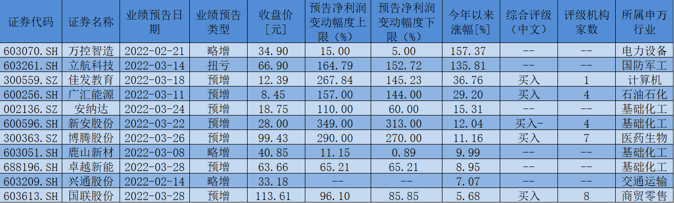 市場表現(xiàn)方面,今年以來,截至3月28日收盤,在上述71只業(yè)績預(yù)喜股中,共有35只個股期間累計漲幅跑贏上證指數(shù)(期間累計下跌11.68%),其中,萬控智造、立航科技、佳發(fā)教育、廣匯能源、安納達(dá)、新安股份、博騰股份等7只個股期間累計漲幅超10%,十分強勢。