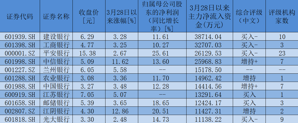 表:3月28日以來,銀行業(yè)主力凈流入資金超過1億元個(gè)股一覽