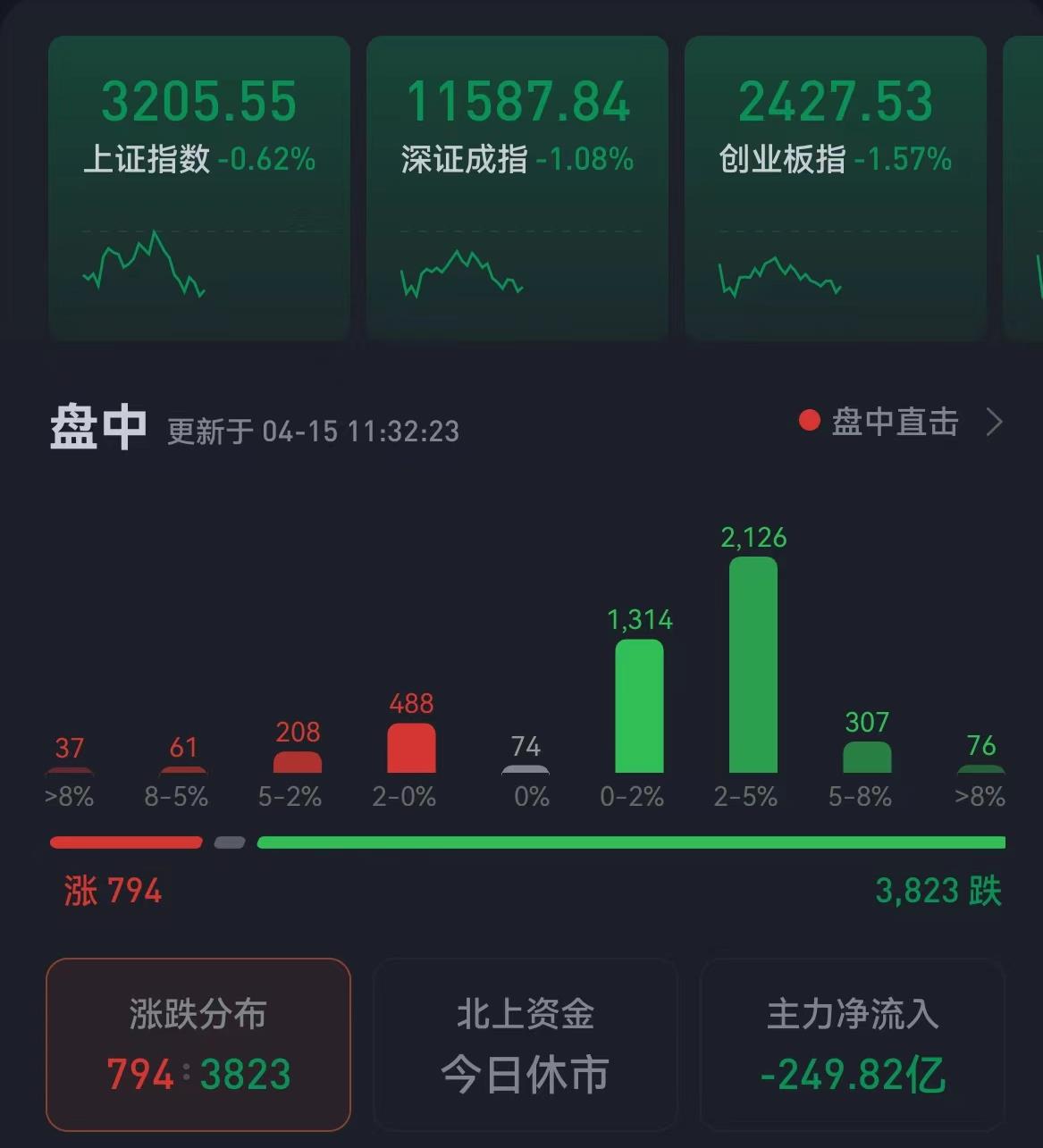 4月15日,A股三大指數(shù)震蕩回落。截至上午收盤,上證指數(shù)跌幅達0.62%,報3205.55點;深證成指和創(chuàng)業(yè)板指跌幅分別為1.08%和1.57%;滬深兩市合計成交額5760.6億元;總體來看,兩市個股跌多漲少,下跌個股達3823只。