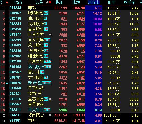 周一,農(nóng)業(yè)股表現(xiàn)出色,養(yǎng)雞、豬肉概念和飼料等三大農(nóng)業(yè)細(xì)分板塊漲幅居前均超4%,分別達(dá)6.17%、4.08%和4.01%。具體看,截至收盤,金河生物、福成股份、仙壇股份、民和股份、粵海飼料、東瑞股份、中水漁業(yè)、農(nóng)發(fā)種業(yè)、益生股份、*ST華資等10只農(nóng)業(yè)股集體漲停。