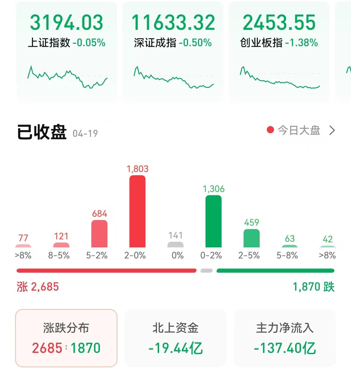 截至收盤,上證指數(shù)跌0.05%報(bào)3194.03點(diǎn),深證成指跌0.5%報(bào)11633.32點(diǎn),創(chuàng)業(yè)板指跌1.38%報(bào)2453.55點(diǎn);兩市合計(jì)成交7793.9億元,北向資金凈賣出19.44億元。