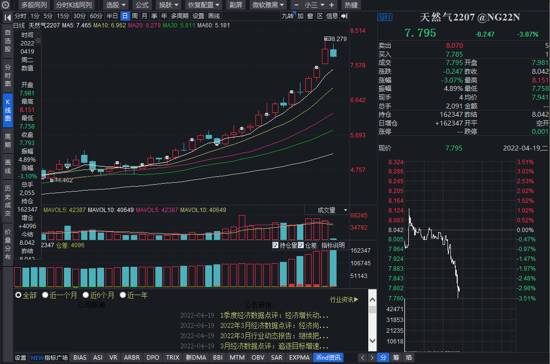 近期,美國天然氣期貨價格持續(xù)上漲。同花順數(shù)據(jù)顯示,上周以來,截至北京時間4月19日5:00,7月份交貨的NYMEX天然氣期貨收盤于7.994美元/百萬英熱,期間累計上漲23.67%;而年初以來,NYMEX天然氣期貨合約價格期間累計上漲117.29%,價格實現(xiàn)翻番。
