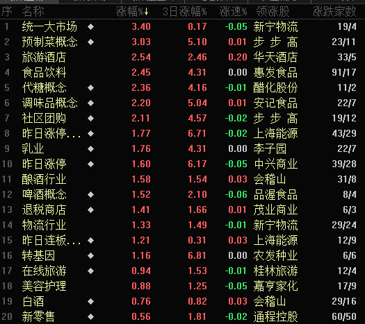 熱點方面,周三,統(tǒng)一大市場、預制菜概念、代糖概念、調味品概念、社區(qū)團購等概念板塊強勢上漲,漲幅均超2%;行業(yè)則以旅游酒店和食品飲料領漲。煤炭、貴金屬和鋼鐵行業(yè)居前,跌幅均在4%以上。