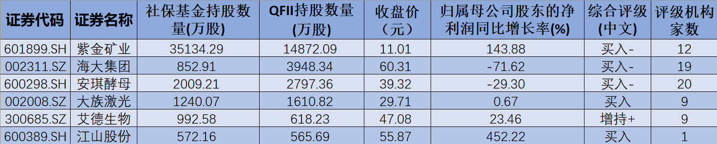 值得注意的是,在上述社?;鸪钟械?7只個(gè)股中,有6只個(gè)股也同時(shí)獲得QFII的持倉。截至2022年一季度末,紫金礦業(yè)獲得QFII持倉量最大,達(dá)到14872.09萬股;此外,包括海大集團(tuán)、安琪酵母、大族激光等在內(nèi)的3只個(gè)股獲得QFII持倉量也超過1000萬股。