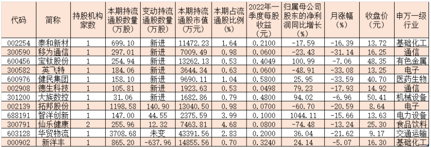 近幾年來,以養(yǎng)老金為代表的長線資金加速入市,而養(yǎng)老金持倉情況也成為市場關(guān)注的焦點。同花順數(shù)據(jù)顯示,截至4月21日15:40,在已披露2022年一季報的324家上市公司中,共有12家公司前十大流通股股東中出現(xiàn)養(yǎng)老金身影,合計持股數(shù)量為7905.51萬股,以2022年一季度末收盤價計算,合計持股市值達12.98億元。其中,有10只個股在今年一季度成為養(yǎng)老金新進增持的重點品種。