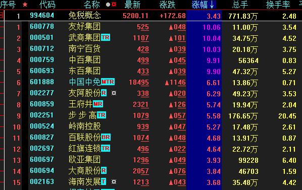 具體來(lái)看,4月26日上午,免稅概念板塊漲幅居首達(dá)3.43%,友好集團(tuán)、武商集團(tuán)、南寧百貨、中百集團(tuán)、東百集團(tuán)等5只概念股集體漲停。