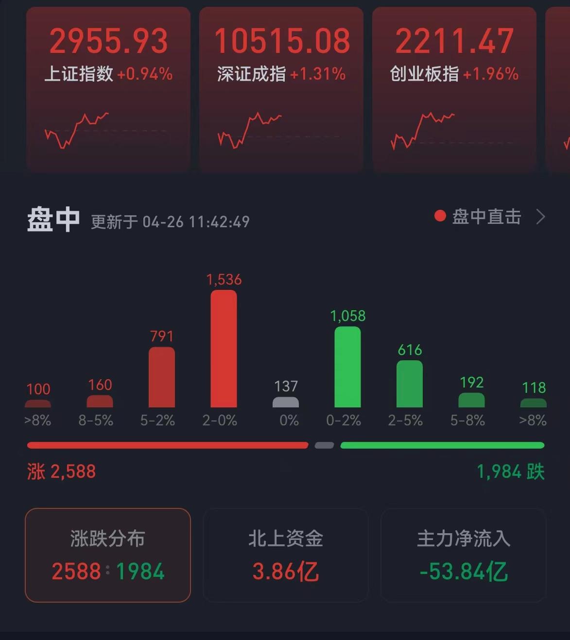 反彈!4月26日,三大股指全線飄紅。截至上午收盤,上證指數(shù)上漲0.94%,報(bào)2955.93點(diǎn);深證成指和創(chuàng)業(yè)板指漲幅分別為1.31%和1.96%;滬深兩市合計(jì)成交額4933.3億元;總體來(lái)看,兩市個(gè)股漲多跌少。