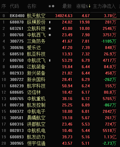 具體來(lái)看,截至5月5日11:30,航天航空行業(yè)中有多達(dá)22只個(gè)股漲幅超5%,其中,縱橫股份和立航科技封漲停板。
