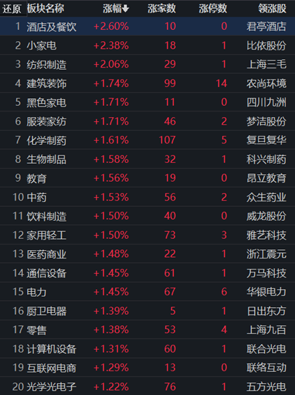 同花順行業(yè)板塊看,有64類行業(yè)上漲,占同花順行業(yè)總數(shù)的84%,其中,酒店及餐飲漲幅居首,漲2.60%,此外,小家電和紡織制造兩行業(yè)漲幅也均超2%,分別達(dá)到2.38%和2.06%。
