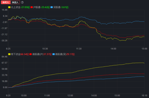 北向資金今日盤中呈流出態(tài)勢,全天凈賣出27.03億元,其中,滬股通凈賣出23.42億元,深股通凈賣出3.61億元。