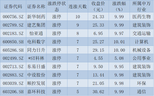 表:連續(xù)上漲且今日收盤漲停股前10位