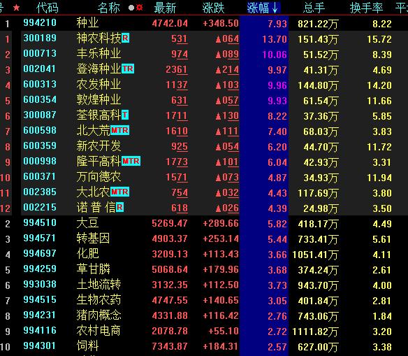 具體來看,5月16日上午,農(nóng)業(yè)股異軍突起,表現(xiàn)出色。其中,種業(yè)板塊漲幅居首達(dá)7.93%,豐樂種業(yè)、農(nóng)發(fā)種業(yè)和敦煌種業(yè)等3只種業(yè)概念股集體漲停。與此同時,農(nóng)業(yè)股中的大豆、豬肉概念等板塊漲幅居前,分別為5.82%、2.76%。