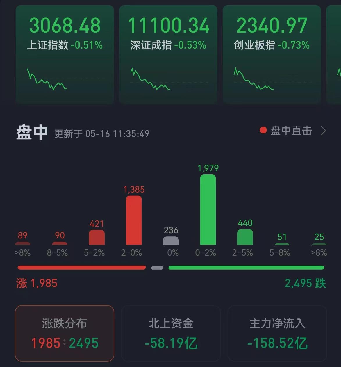 5月16日,三大股指震蕩回落。截至上午收盤,上證指數(shù)跌幅達(dá)0.51%,報3068.48點;深證成指和創(chuàng)業(yè)板指跌幅分別為0.53%和0.73%;滬深兩市合計成交額5254.4億元;總體來看,兩市個股漲少跌多,上漲個股達(dá)1985只,有2495只個股下跌。