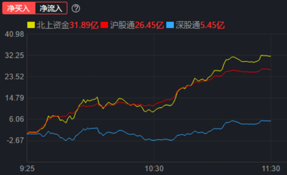 資金方面,北向資金早盤凈買入31.89億元,其中,滬股通凈買入26.45億元;深股通凈買入5.45億元。