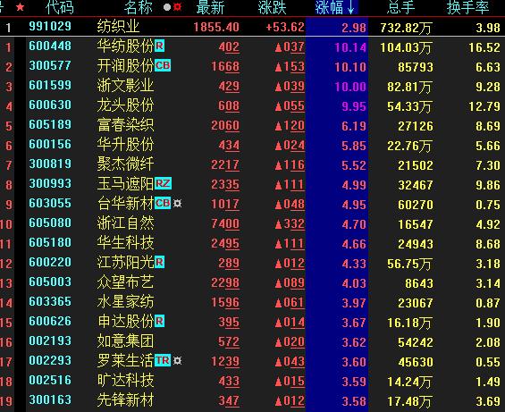 5月18日,大智慧紡織業(yè)板塊漲幅居首,達(dá)2.98%。其中,華紡股份、浙文影業(yè)、龍頭股份等3只概念股集體漲停。