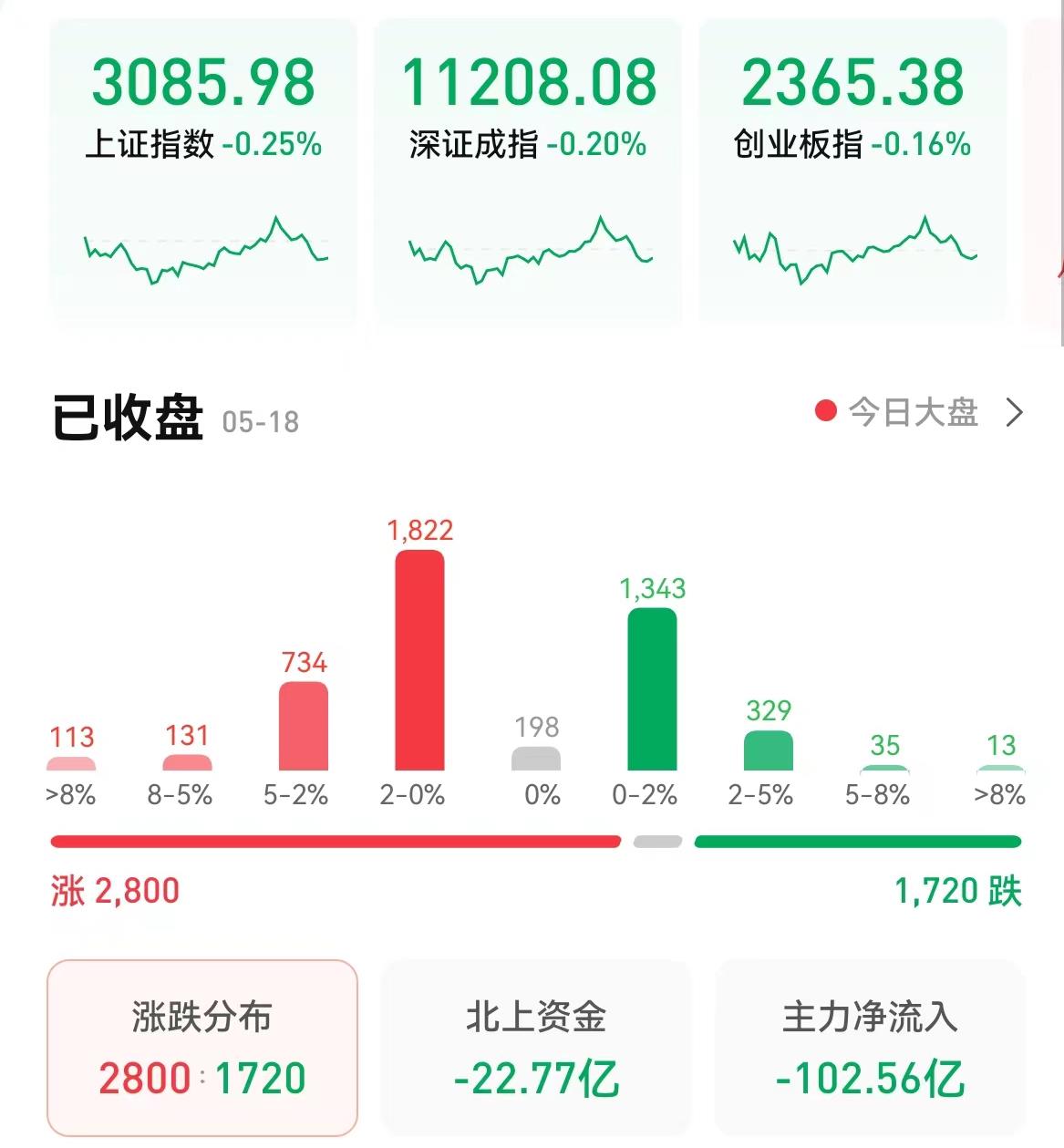 5月18日,三大股指震蕩走低,集體收跌,截至收盤,上證指數(shù)跌0.25%報3085.98點(diǎn);深證成指跌0.2%報11208.08點(diǎn);創(chuàng)業(yè)板指跌0.16%報2365.38點(diǎn);兩市合計成交7703億元,北向資金凈賣出22.77億元??傮w來看,兩市個股漲多跌少。