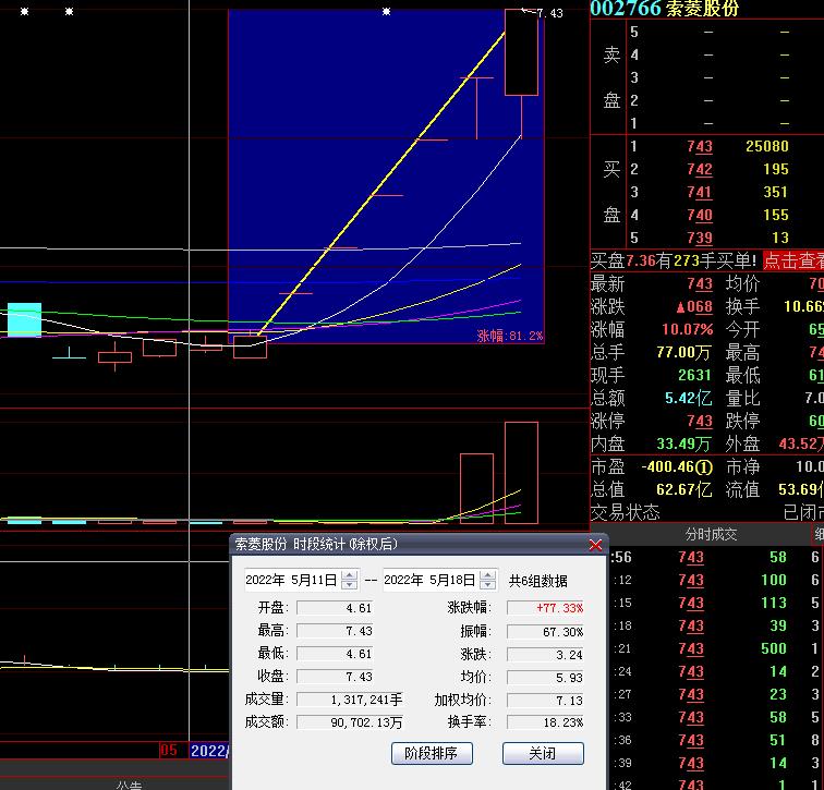 5月18日,索菱股份再度漲停,截至收盤,報7.43元,連續(xù)6個交易日漲停,期間累計漲幅達(dá)77.33%。