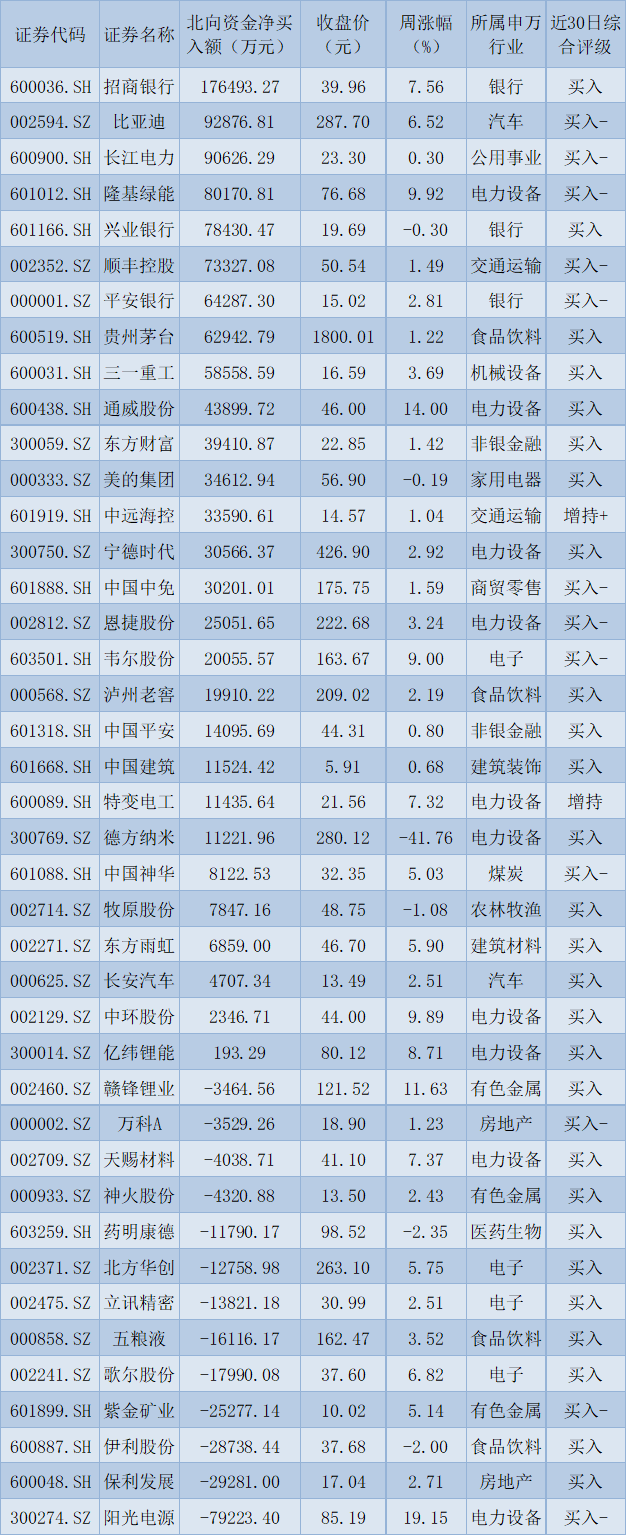 資金方面,北向資金本周累計凈買入金額達(dá)152.18億元。從前十大成交活躍股來看,本周,招商銀行、比亞迪和長江電力等3只個股,北向資金凈買入金額均超9億元。另外,陽光電源、保利發(fā)展、伊利股份、紫金礦業(yè)等個股遭北向資金凈賣出金額均超2億元。