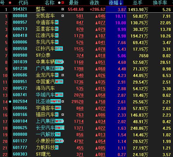 5月23日,整車板塊漲幅居首,達(dá)3.87%。其中,安凱客車、中通客車、亞星客車、江淮汽車、江鈴汽車等個股紛紛漲停。